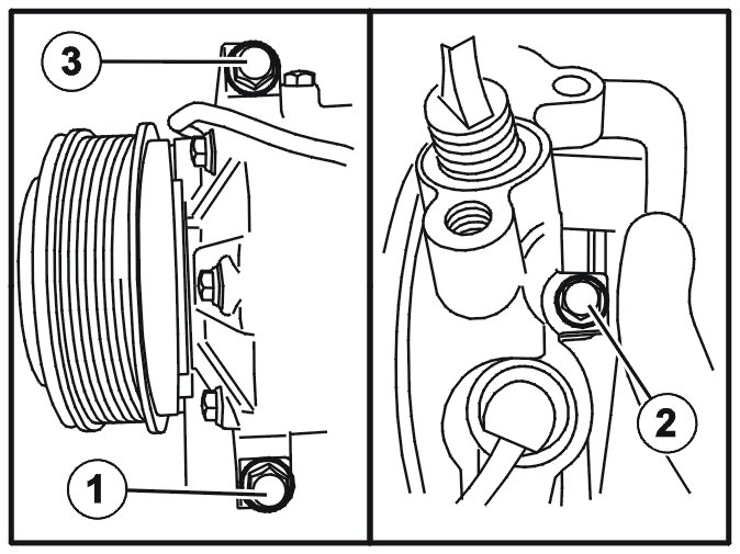 Install the compressor with the connectors turned outwards (as illustrated). Position the compressor in the sub-frame.