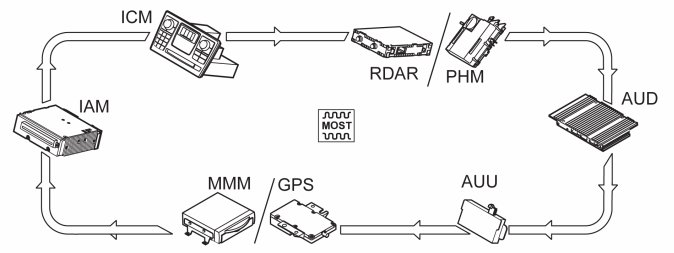 The MOST network is an optical network in which all control modules included are connected in a ring. All messages in the MOST network travel in one and the same direction from the infotainment control module (ICM) to the integrated audio module (IAM).