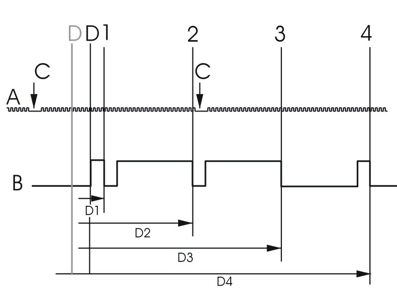 The illustration shows how the signals relate to each other when the camshaft is controlled (deployed camshaft), D1 - D4 is reduced.