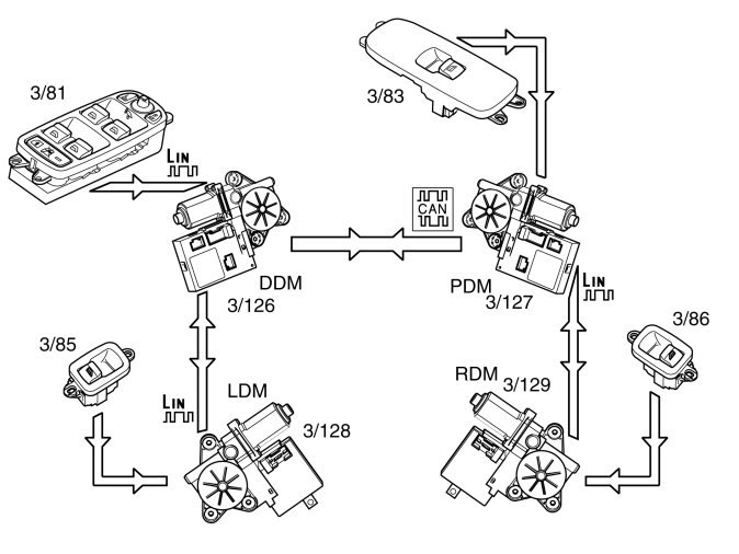 The signals for operating the rear window on the passenger side are transmitted from the driver door module (DDM) via the controller area network (CAN) to the passenger door module (PDM) and then to the rear window using LIN-communication (does not apply to the C30).