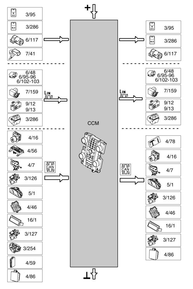 The number of components on the LIN buses varies, depending on the equipment level of the vehicle (ECC/MCC and any options) and whether the vehicle is left or right-hand drive.