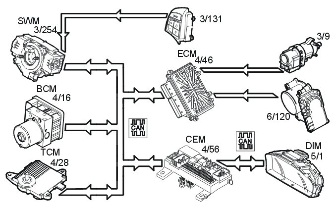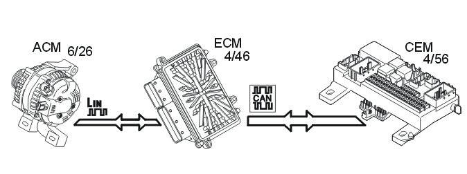 The engine control module (ECM) (4/46) regulates the charge voltage of the generator (GEN) (via LIN communication) when requested by the central electronic module (CEM) (4/56) (via CAN communication).