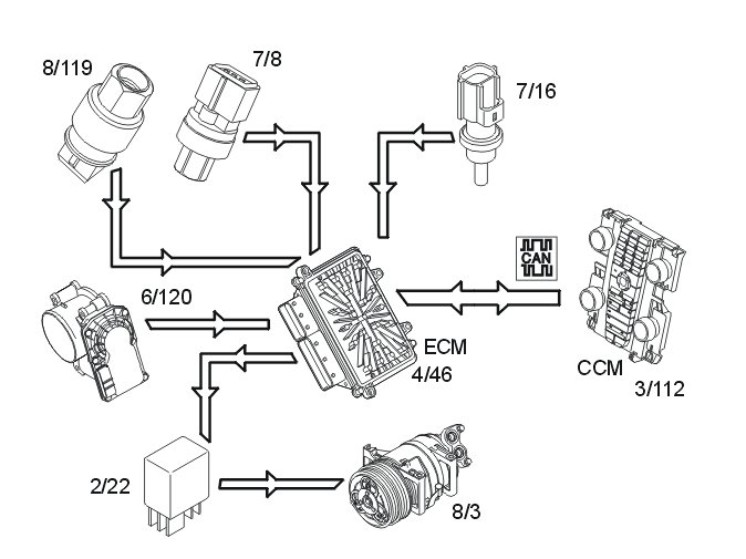The air conditioning (A/C) compressor is controlled by the engine control module (ECM) (4/46) on request from the climate control module (CCM) (3/112) via the controller area network (CAN). When the engine control module (ECM) receives a signal from the climate control module (CCM) to activate the air conditioning (A/C) compressor, the engine control module (ECM) grounds the circuit for the relay coil for the A/C compressor. See also: Design Design