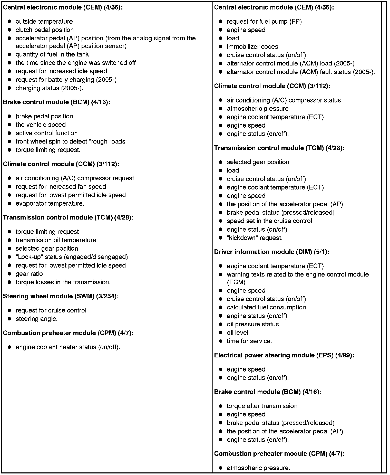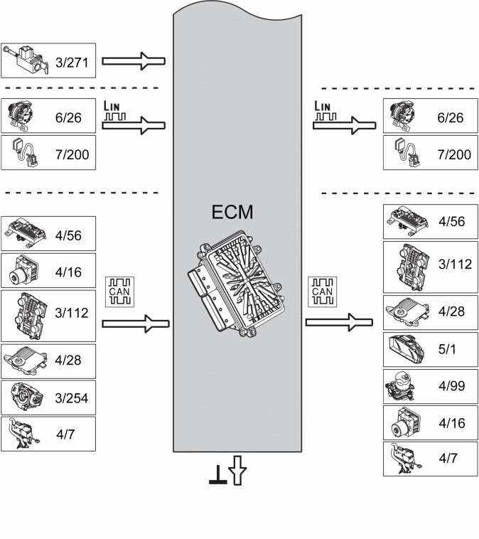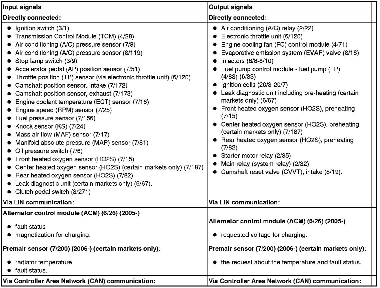The table below summarizes the input signals to and output signals from the Engine Control Module (ECM). The signal types are divided into directly connected signals, serial communication and controller area network (CAN) communication. The illustration below displays the same information with the Volvo component designations.