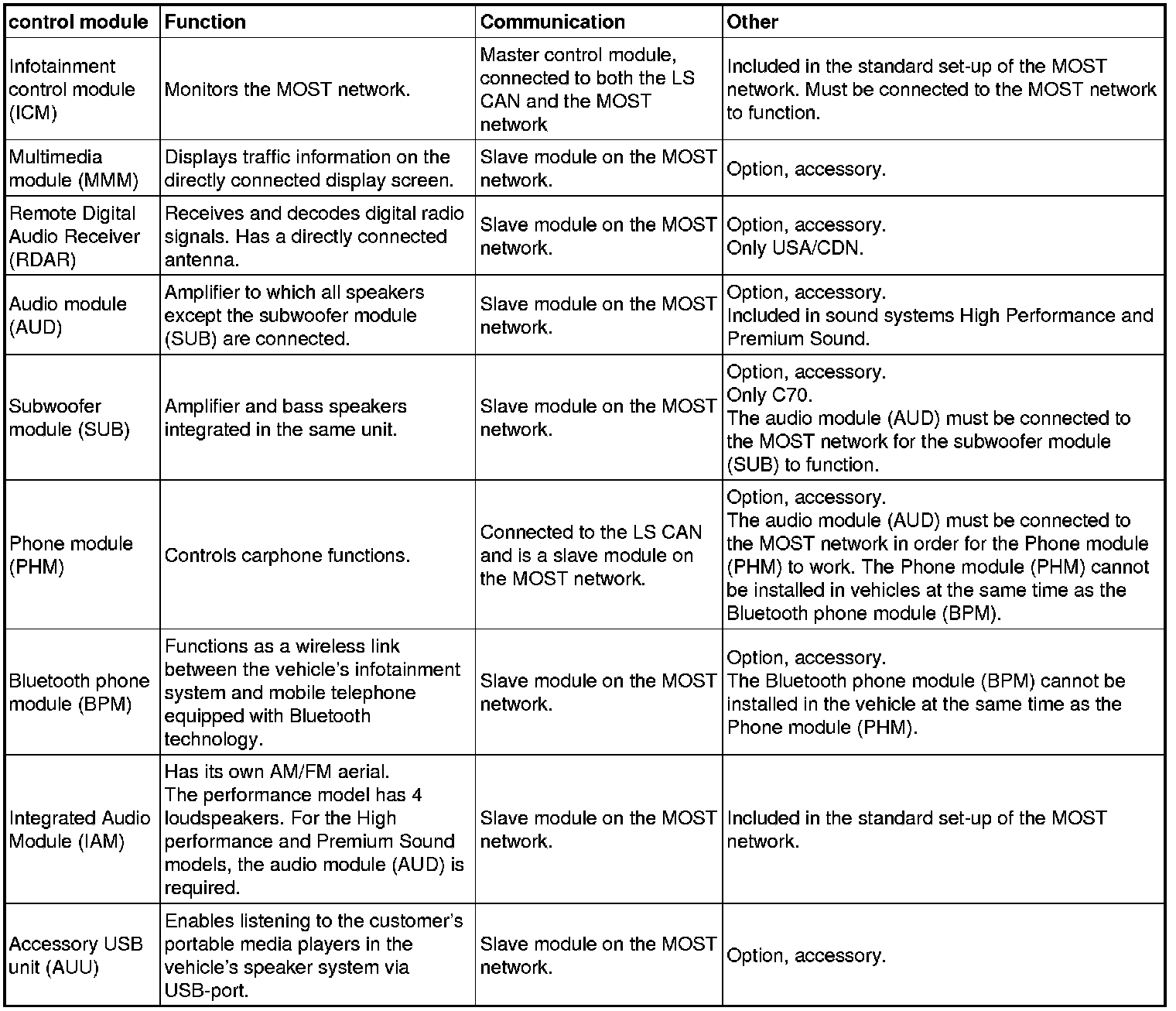 The table below lists all the control modules which may be included in the MOST network.