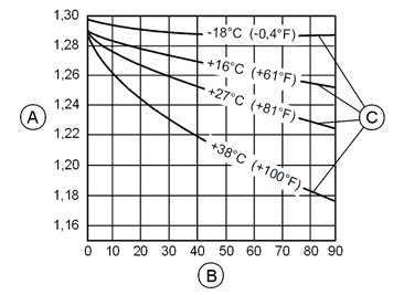 - C. Acid density at different battery temperatures.