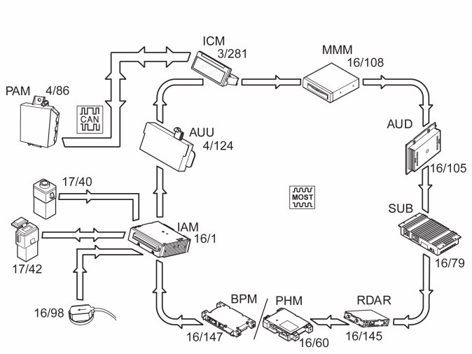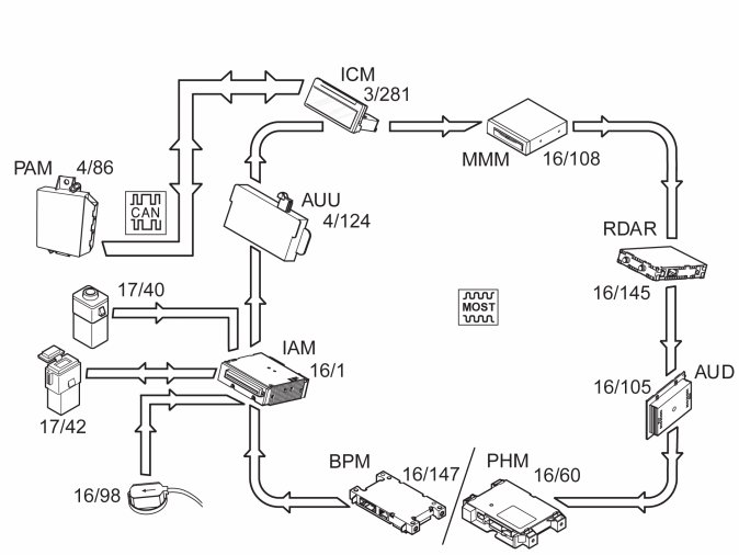 The integrated audio module (IAM) functions as a stereo system in the vehicle and is connected to other control modules on the MOST network.