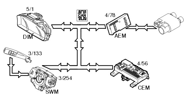 steering wheel module (SWM) (3/254) which transmits a signal via the Controller area network (CAN) to the central electronic module (CEM) (4/56), which in turn transmits the signal on to the