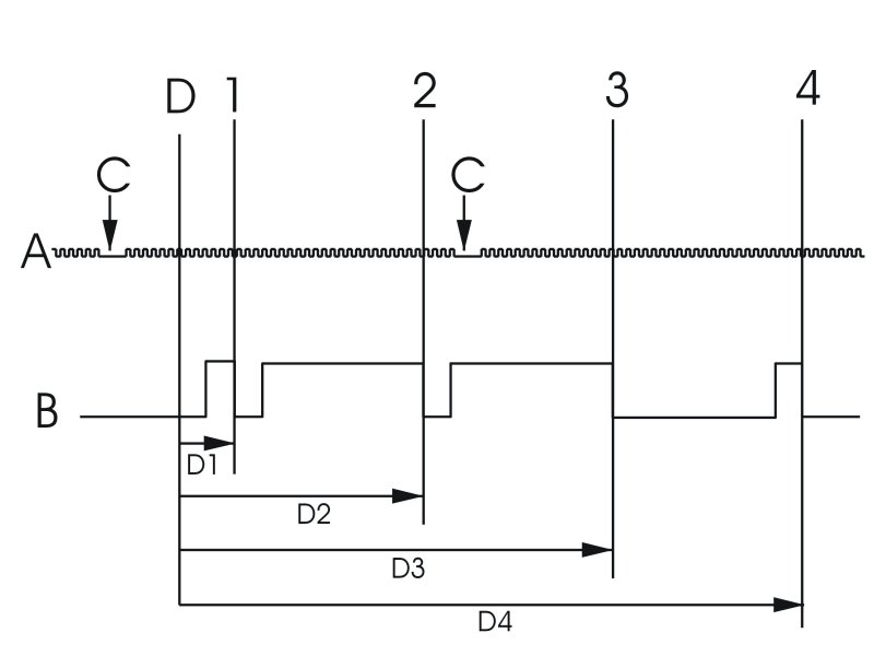 The illustration shows how the signals relate to each other when the camshaft is controlled (deployed camshaft), D1 - D4 is reduced.