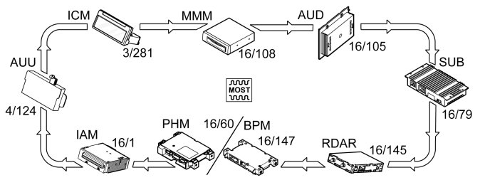 The MOST network is an optical network in which all control modules included are connected in a ring. All messages in the MOST network travel in one and the same direction from the infotainment control module (ICM) to the Accessory USB unit (AUU).