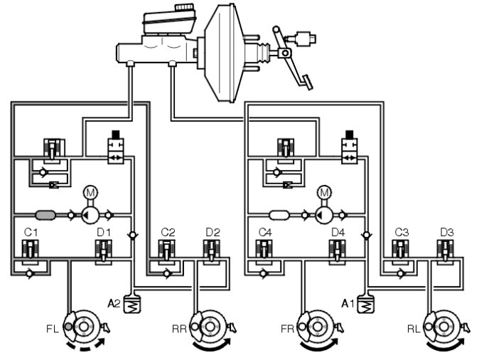 In the example above, the steering wheel was turned to the right, but the vehicle tends to continue straight ahead. The SV valve (separation valve) closes, the ESV valve (electronic shuttle valve) opens and the pump starts. The DSTC system applies the brakes to the right rear wheel by leaving intake valve C2 open and closing the other intake valves (C1, C3 and C4).