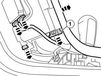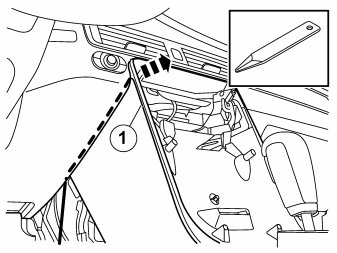 Angle/pull out the upper section of the centre console to create a larger gap between the dashboard and tunnel console, and to make it easier to press the cable completely inside the tunnel console's side wall (1).