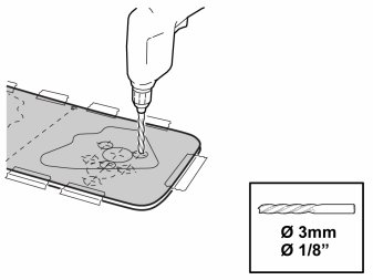 - Carefully predrill the holes according to the template using a -3 mm (1/8") drill bit.