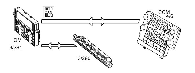 The infotainment control module (ICM) (3/281) is partially controlled by the control module's own keypad (3/290) and partially by the keypad on the climate control module (CCM) (4/6). The signals from the keypad on the climate control module (CCM) are transmitted via the control area network (CAN).