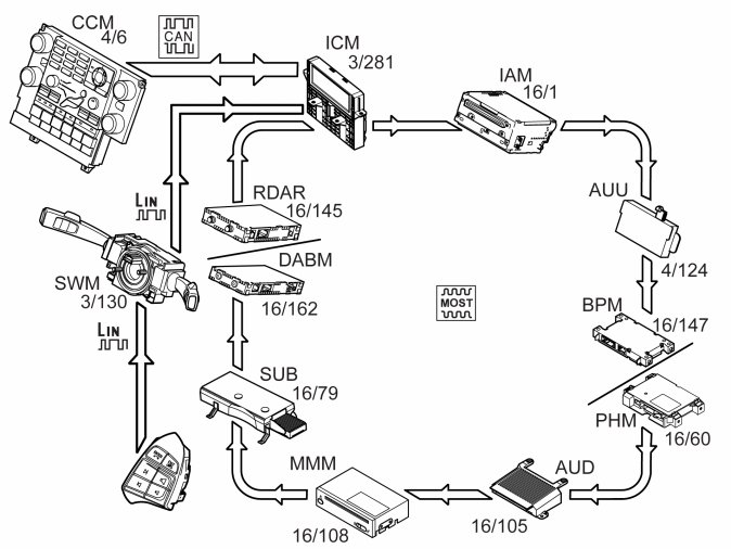 The signals from the steering wheel buttons are transmitted to the steering wheel module (SWM) with LIN communication. The steering wheel module (SWM) transmits the signals on to the Infotainment Control Module (ICM) (3/281) using LIN communication. The infotainment control module (ICM) in turn transmits the signals on to the affected control module on the MOST network.