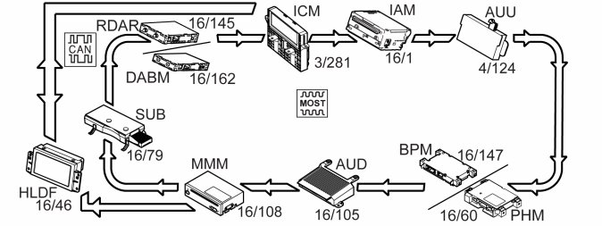 If a control module is not in the stored list, it is disconnected from the MOST network and the functionality of this control module is blocked. This means that control modules in the MOST network cannot be moved from one vehicle to another. This function also applies to the High Level Display Front (HLDF), which communicates with the infotainment control module (ICM) via the controller area network (CAN).