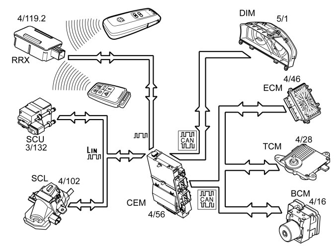 To carry out a start of a keyless vehicle, a pedal must be depressed (clutch (MAN) or brake (AUT)) and the starter button pushed. When the starter button is pushed, an input on the keyless vehicle module (KVM) (4/93) is grounded, which searches for a remote key with passive function in the vehicle. Ground connection from the starter button also goes to the Central electronic module (CEM) (4/56), which, at the same time, transmits an encrypted request to the Keyless vehicle module (KVM). This request is responded to only if an approved passive remote key has been registered. If a remote key is found, the keyless vehicle module (KVM) checks that it is approved. If this is the case, the keyless vehicle module (KVM) transmits a response to the central electronic module (CEM) indicating that the remote key is approved.