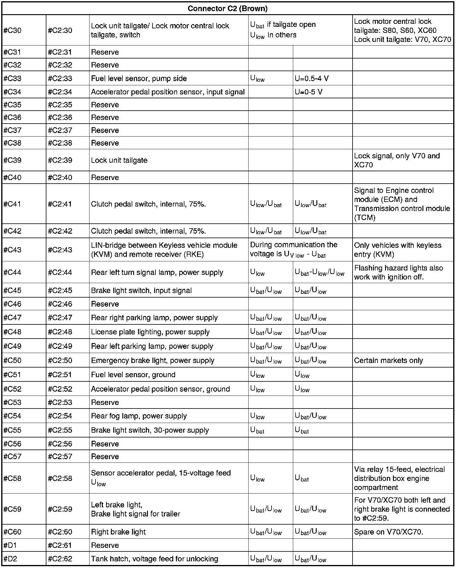 All values given below are between the terminals stated in column 1 and terminal #D5 (power ground). This applies unless otherwise indicated in the last column.