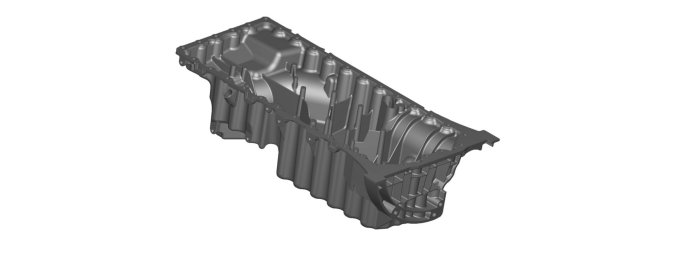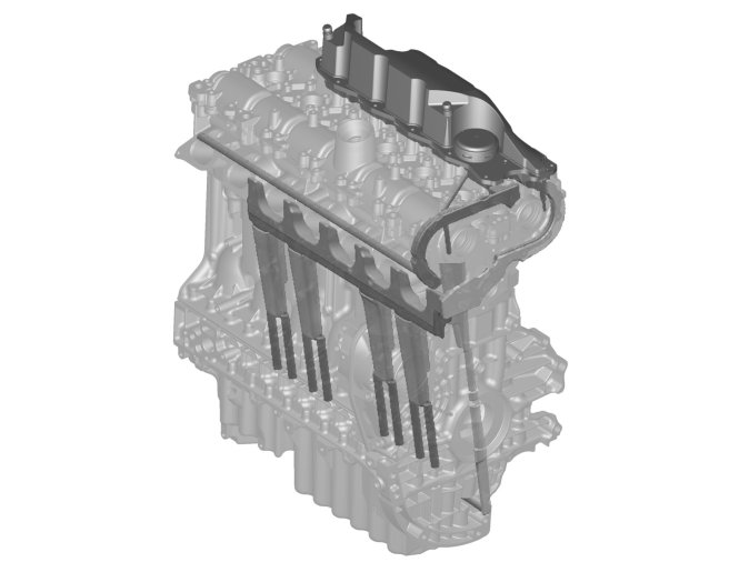 The oil pan is designed to reduce mechanical noise from the engine, at the same time as providing a reliable supply of oil at different angles. A composite oil scraper keeps the larger section of the oil volume away from the rotating crankshaft. It minimizes power loss, improves fuel economy and prevents the oil from foaming.