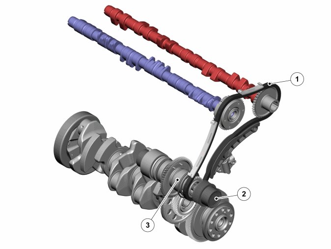 Both camshafts are driven by a camshaft chain, which in turn, is driven by the crankshaft via the intermediate shaft. The camshaft chain has inverted teeth, so called, "silent chain".