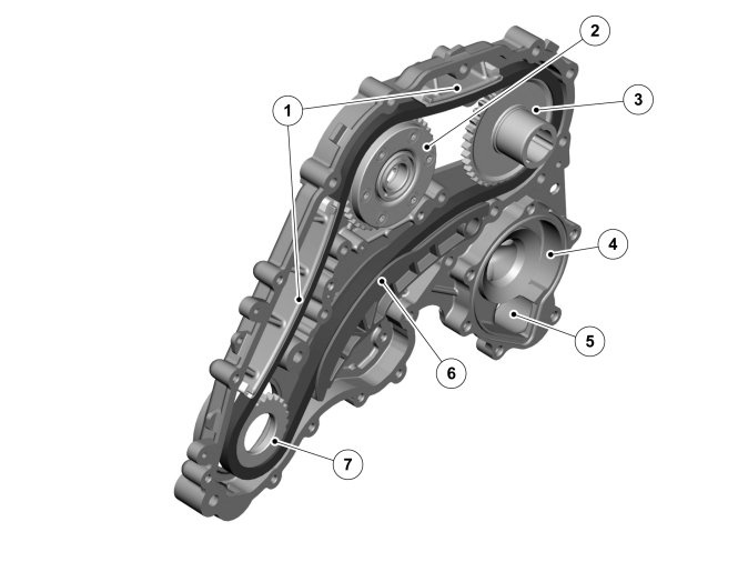 The oil pump is in the oil pan, mounted underneath the intermediate section. The oil pump has an integrated relief valve. The pump is directly driven by the sprocket on the rear end of the crankshaft.