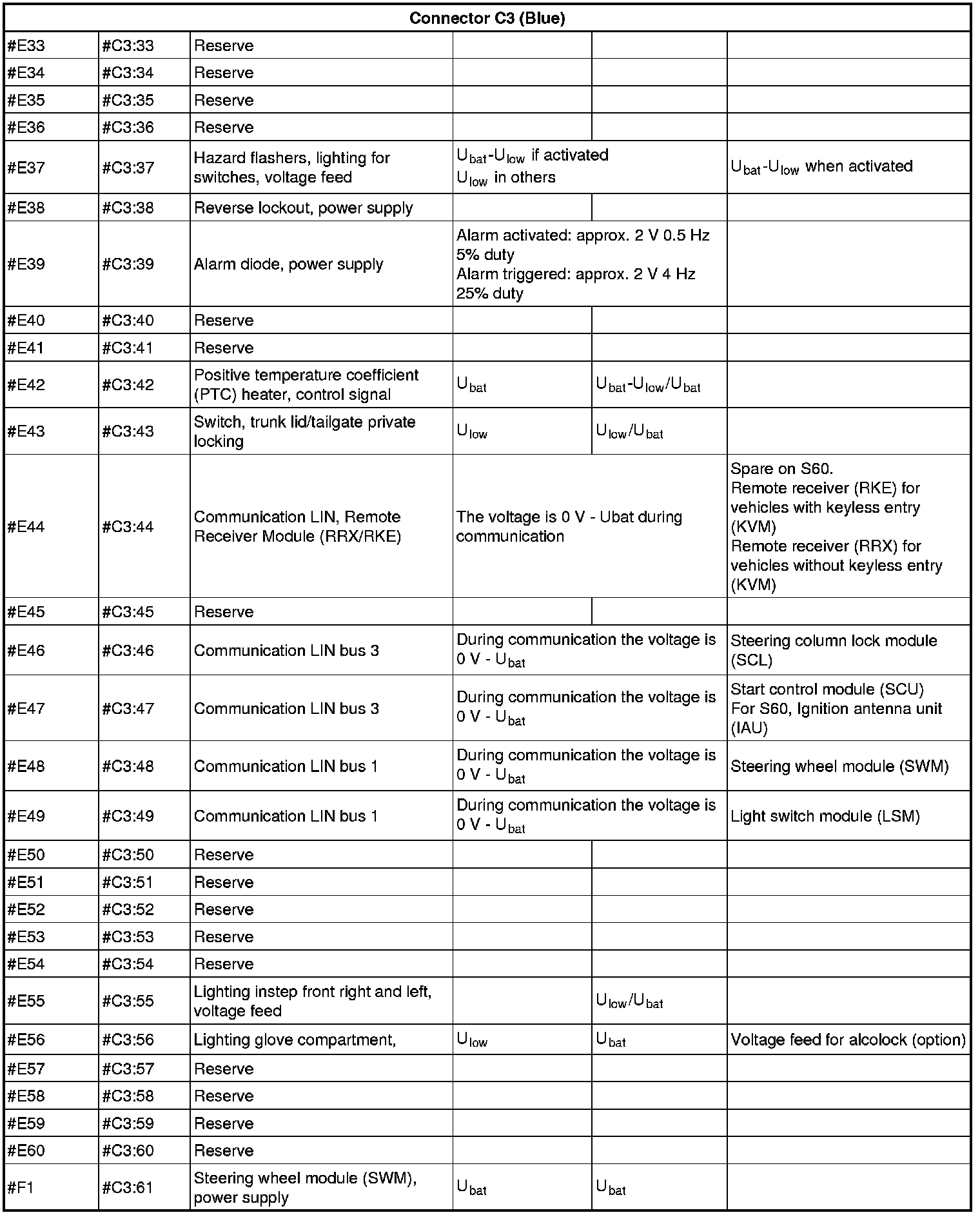 All values given below are between the terminals stated in column 1 and terminal #D5 (power ground). This applies unless otherwise indicated in the last column.