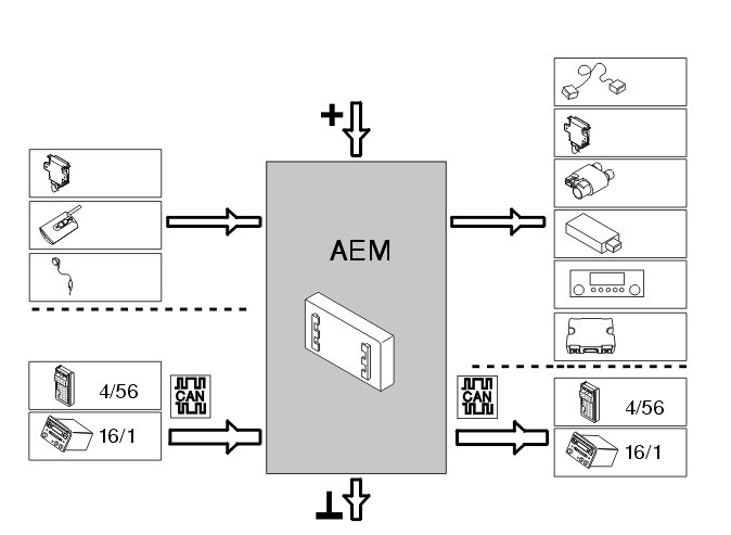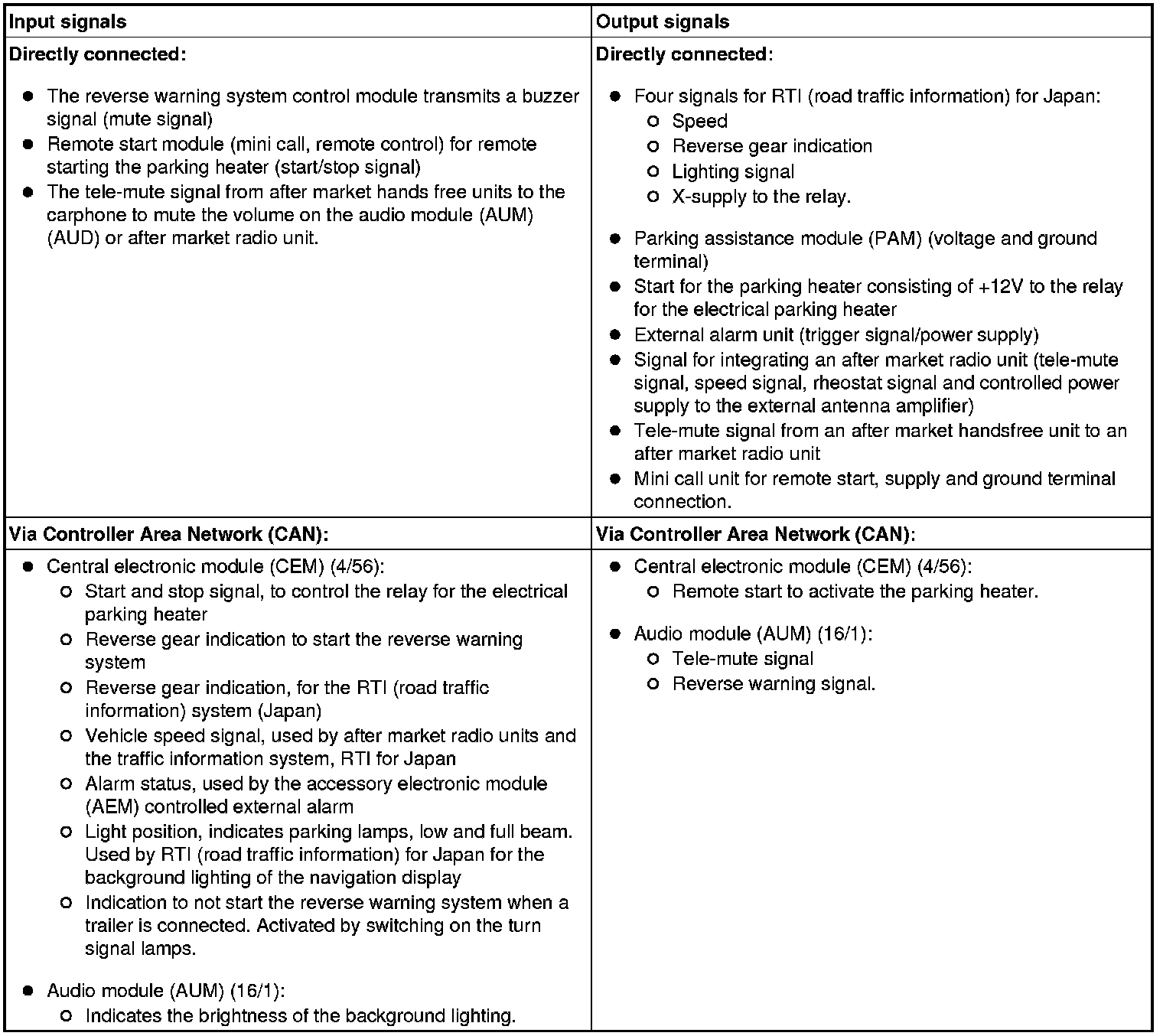 The table below summarizes the input and output signals to and from the accessory electronic module (AEM) (4/78). The signal types are divided into directly connected signals and Controller area network (CAN) communication. The following illustration displays the same information with the Volvo component designations.