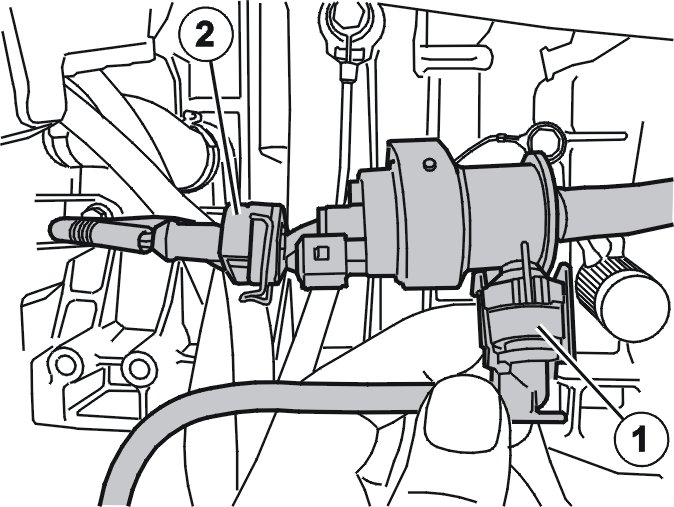 Disconnect the EVAP-pump, located under the inlet manifold in front of the engine in rubber mounting. Press together the lock on the outlet hose (1) and pull it loose. Press aside the lock on the connector (2) and disconnect it.