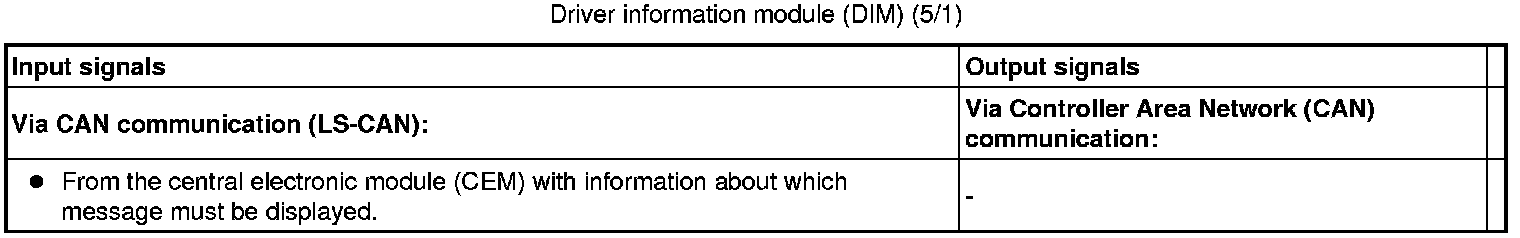 The tables below summarize the input and output signals to the units in the system for the immobilizer. The signal types are divided into directly connected signals, serial communication and controller area network (CAN) communication.