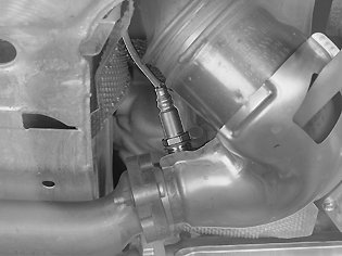 Unplug the connector of the front heated oxygen sensor from above. Remove the oxygen sensor using 999 5543 SOCKET NV-22 HO2S 999 5543 Socket NV-22 HO2S.