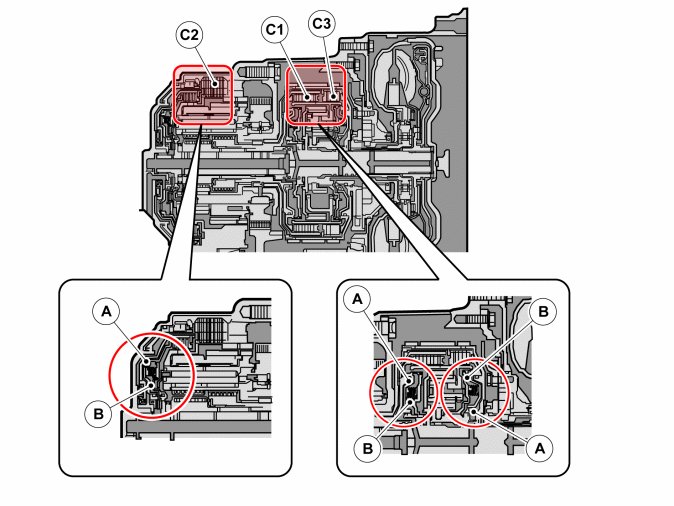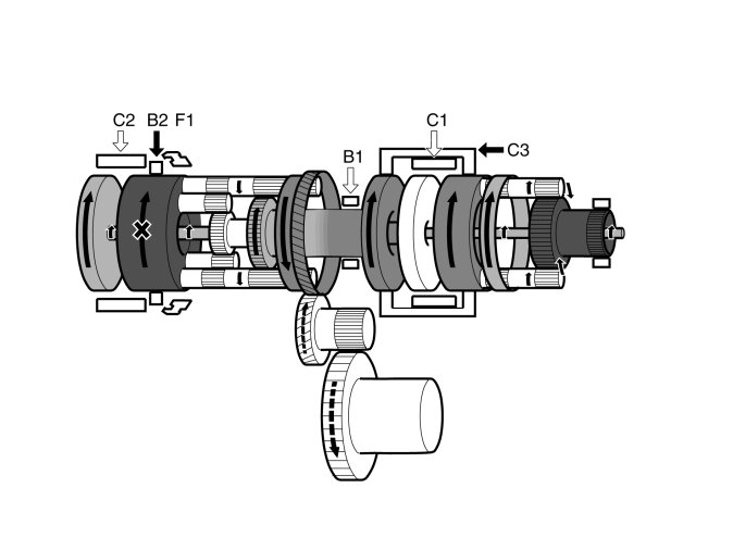 Clutch C3 rotates clockwise and connects the front planetary gear carrier with the rear planetary train's large sun gear.