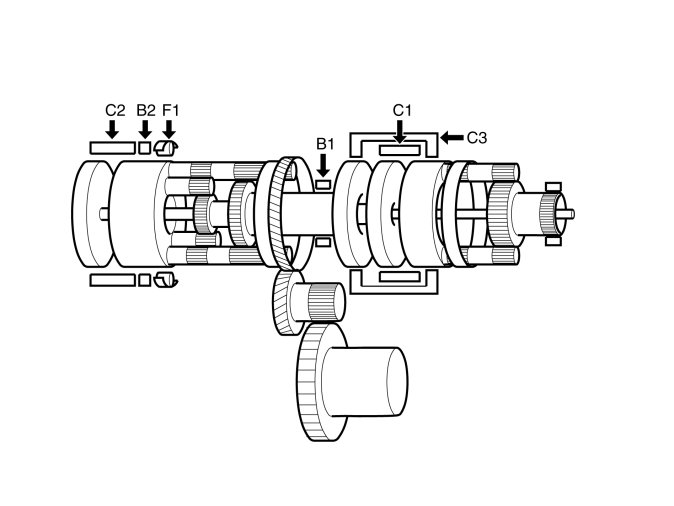 The planetary gear's ratios are controlled by 3 clutches (C1, C2, C3) and 2 brakes (B1, B2).