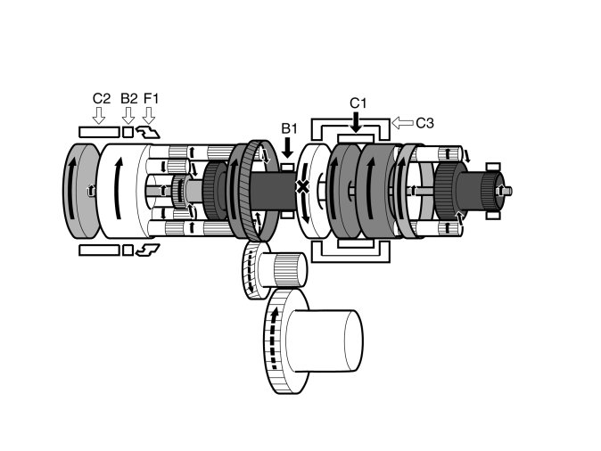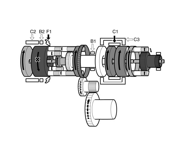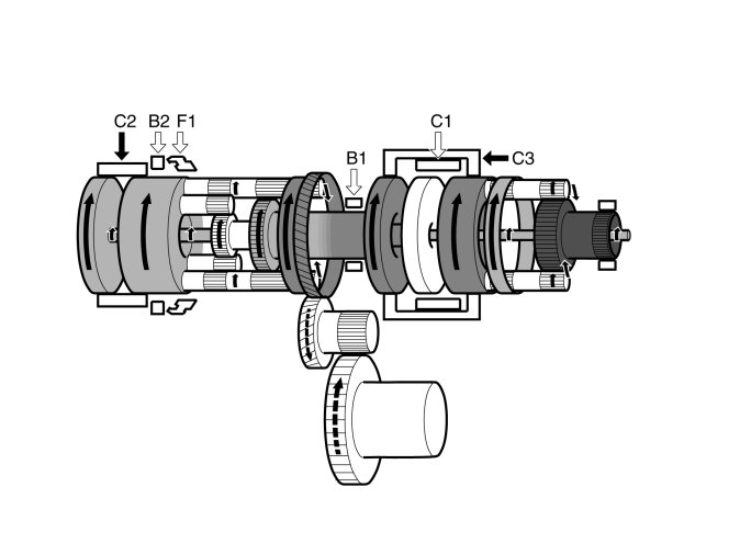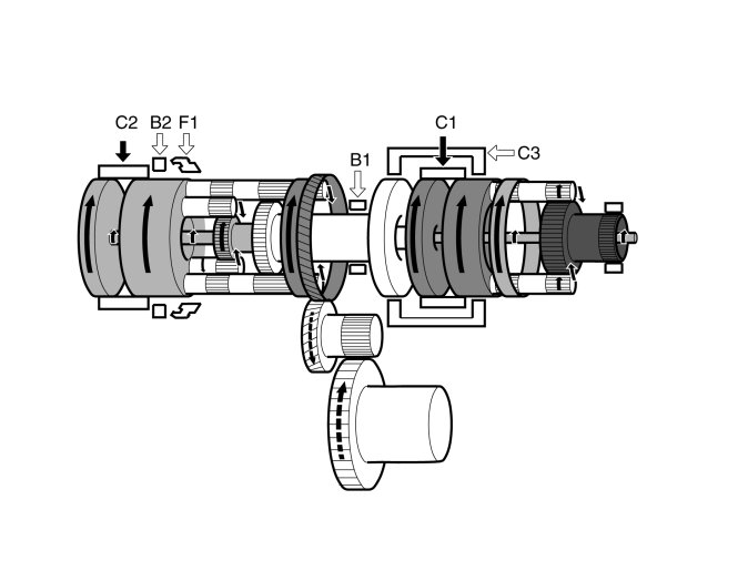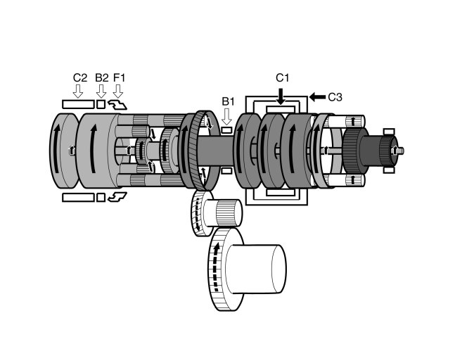 Clutch C1 rotates clockwise and connects the front planetary gear carrier with the rear planetary train's small sun gear.