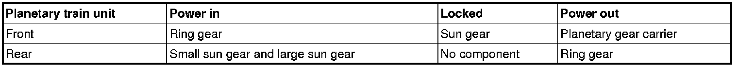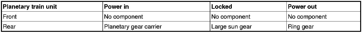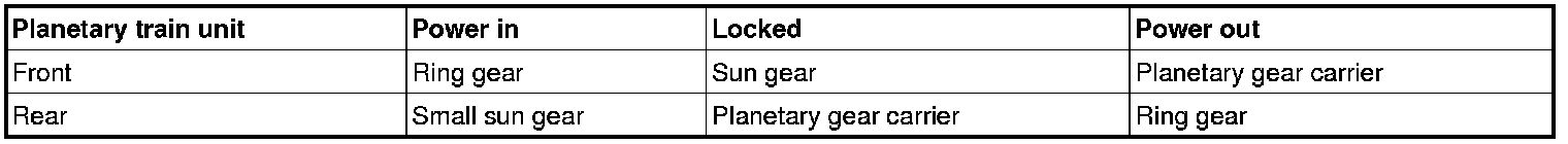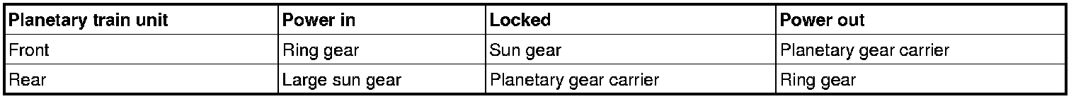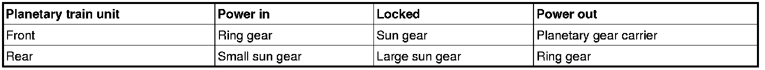 The rear planetary train rotates clockwise. Because the rear planetary train's inner and outer planetary gears are in constant engagement with each other, they are kinetically locked in relation to each other. The kinetic energy from both the rear planetary train's sun gears is therefore transferred to the rear planetary train's ring gear.
