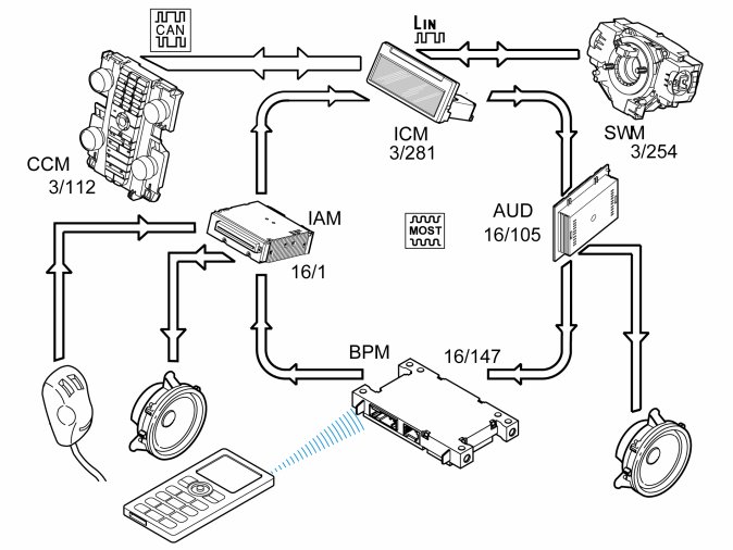 During conversations via handsfree the microphone and speakers which are connected to the Audio module (AUD) (16/105) and Integrated Audio Module (IAM)(16/1) are used. Bluetooth phone module (BPM) transmits a request to the Infotainment control module (ICM) to receive access to the speakers and microphone. The infotainment control module (ICM) transmits the request onward to the Audio module (AUD) and Integrated Audio Module (IAM). The communication between the Bluetooth phone module (BPM), infotainment control module (ICM), Audio module (AUD) and Integrated Audio Module (IAM) occurs via the MOST network.
