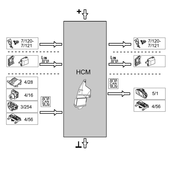 Headlamp Control Module (HCM) communicates both with directly connected components, and with other control modules via CAN-communication and LIN-communication.