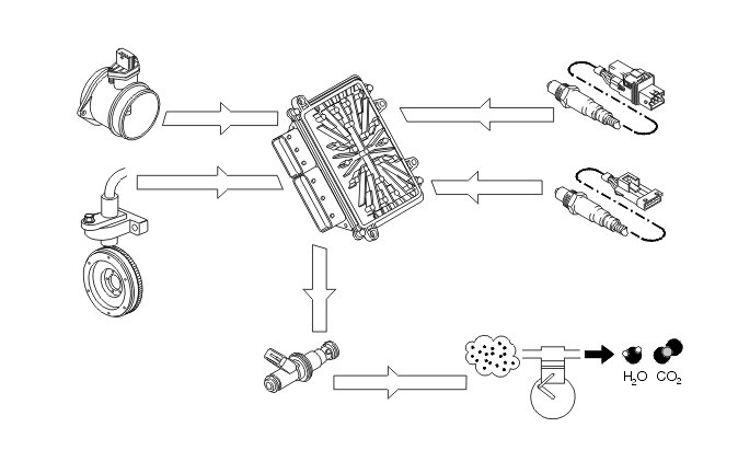 The adaptive adjustments of the injection period are stored continuously in the control module. This means that under different operating conditions the fuel air mixture is obtained before the heated oxygen sensor (HO2S) is warm enough to function.