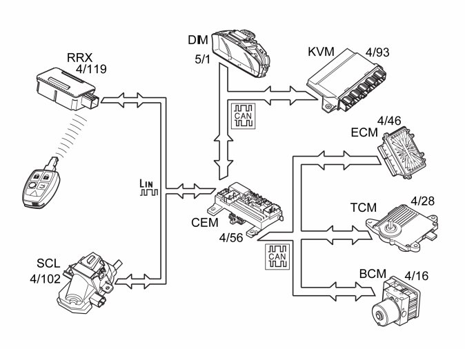 If a passive key is not registered, the keyless vehicle module (KVM) will transmit a negative response to the central electronic module (CEM). The central electronic module (CEM) will then transmit a request to the start control module (SCU) instead to search for a transponder. The central electronic module (CEM) will approve the key if a transponder is found.