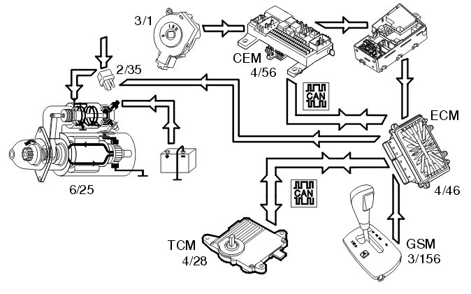 When the ignition key is turned to position III, the starter motor relay (2/35) receives power at terminal 86. If the immobilizer check is OK, then the engine control module (ECM) grounds the relay at terminal 85 and the relay is activated. Control solenoid terminal 6/25:2 is powered from relay terminal 87. This creates a magnetic field in hold-in and pull-in winding. This moves the moving steel core. When the core shifts a lever, fixed in the end of the core, presses the starter motor pinion to engage in the ring gear on the flywheel/flange.