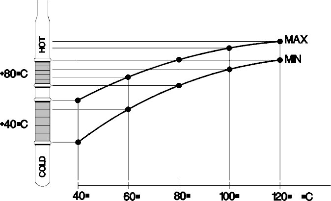 The "cold range" (+40 °C) is reached after approximately 15 minutes idling in the workshop, while the "hot range" (+80 °C) is reached after approximately 30 minutes highway driving at an air temperature above +15 °C.