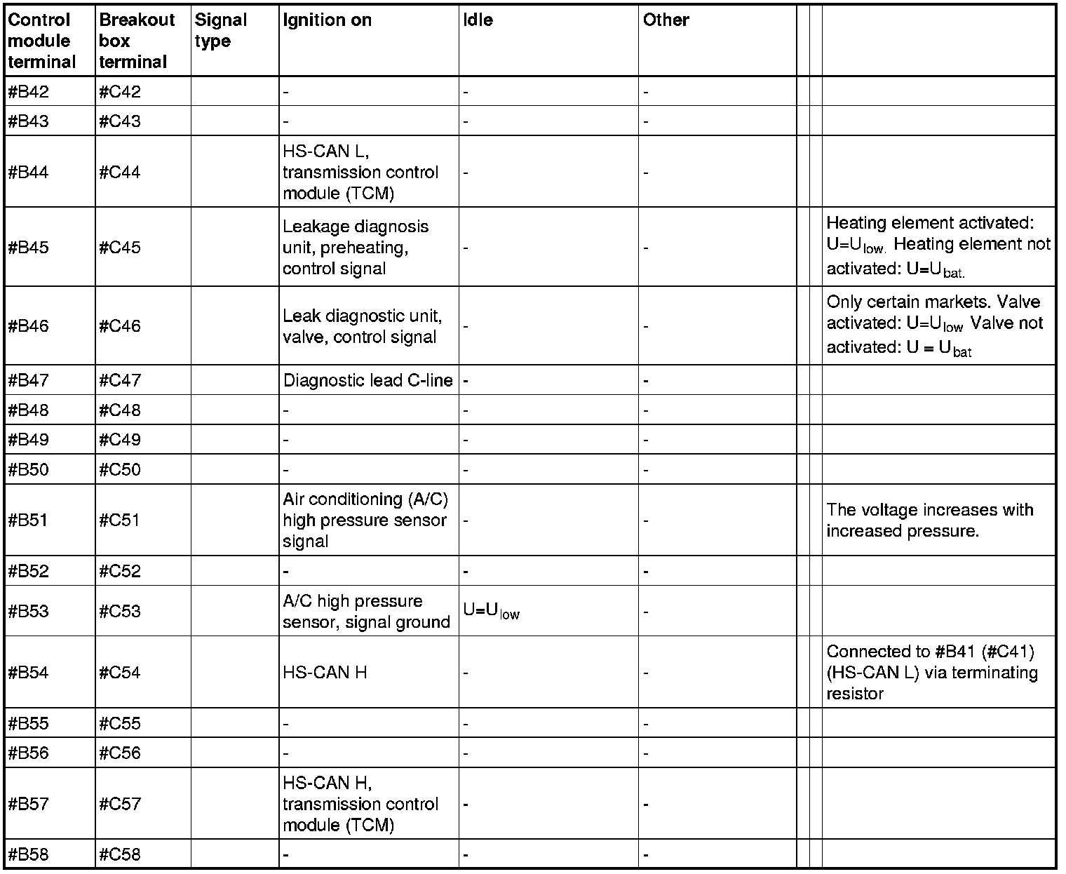 All values given below are between the terminals stated in column 1 and breakout box terminal in the terminal) and terminal #B1 (#C1) unless otherwise indicated in column 6 (Miscellaneous).