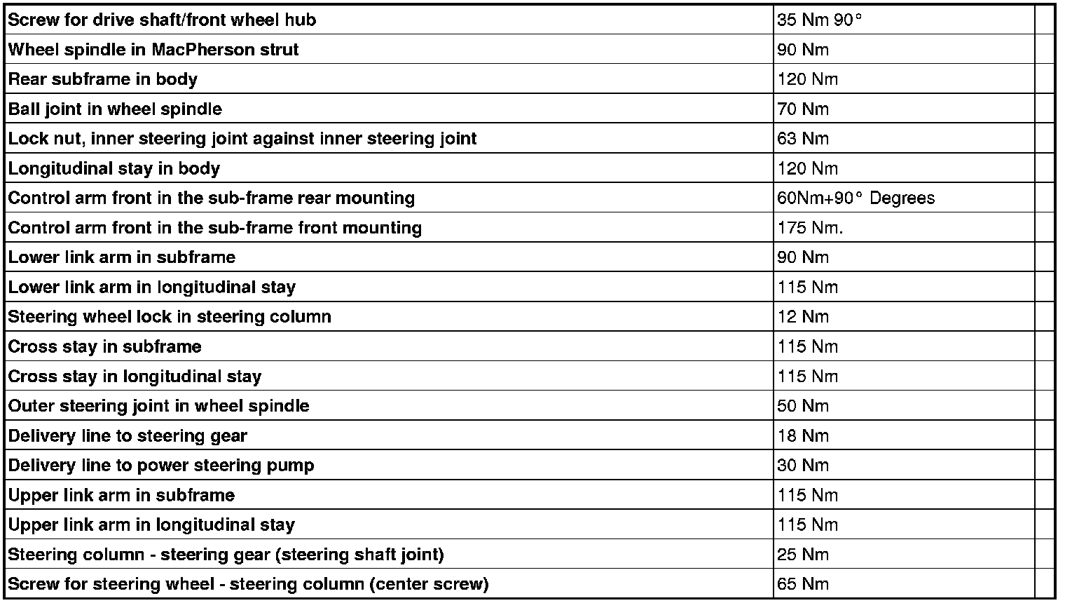 See the table below to find the tightening torques for components not included in the summary.