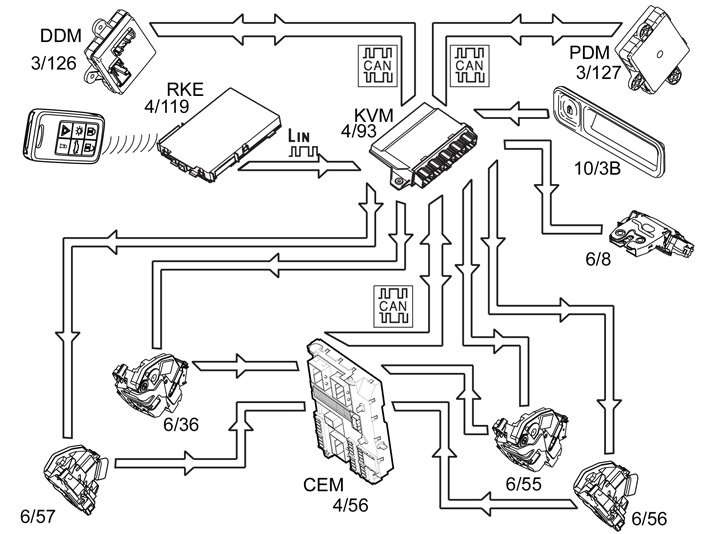 If there is a keyless entry system, the keyless vehicle module (KVM) checks the identity of the remote key during locking and unlocking. After checking the key identity, the keyless vehicle module (KVM) then transmits a command to the central electronic module (CEM) to lock or unlock the central locking. To reduce response time when unlocking, first the keyless vehicle module (KVM) sends an unlock command to relevant door control module. Keyless vehicle module (KVM) uses the antennas in the outer handles on the side doors and in the rear bumper to check the identity of the remote key.