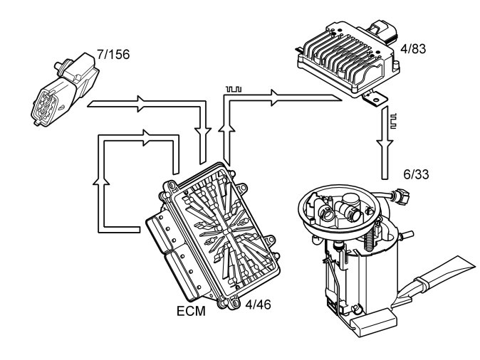 The engine control module (ECM) calculates the desired fuel pressure. A signal is then transmitted to the fuel pump control module indicating the desired fuel pressure. Serial communication between the engine control module (ECM) and the fuel pump control module is used to carry the signal. The fuel pump control module then operates the fuel pump unit to obtain the desired pressure using a pulse width modulation (PWM) voltage on the ground lead. The fuel pump (FP) can be controlled steplessly by changing the pulse ratio of the pulse width modulation (PWM) signal. Only that pressure which is required at that specific time will then be released to the fuel rail/injectors. The value of the pulse width modulation (PWM) signal is a measurement of the operational load of the fuel pump (FP) (% duty, 100% = maximum pressure).