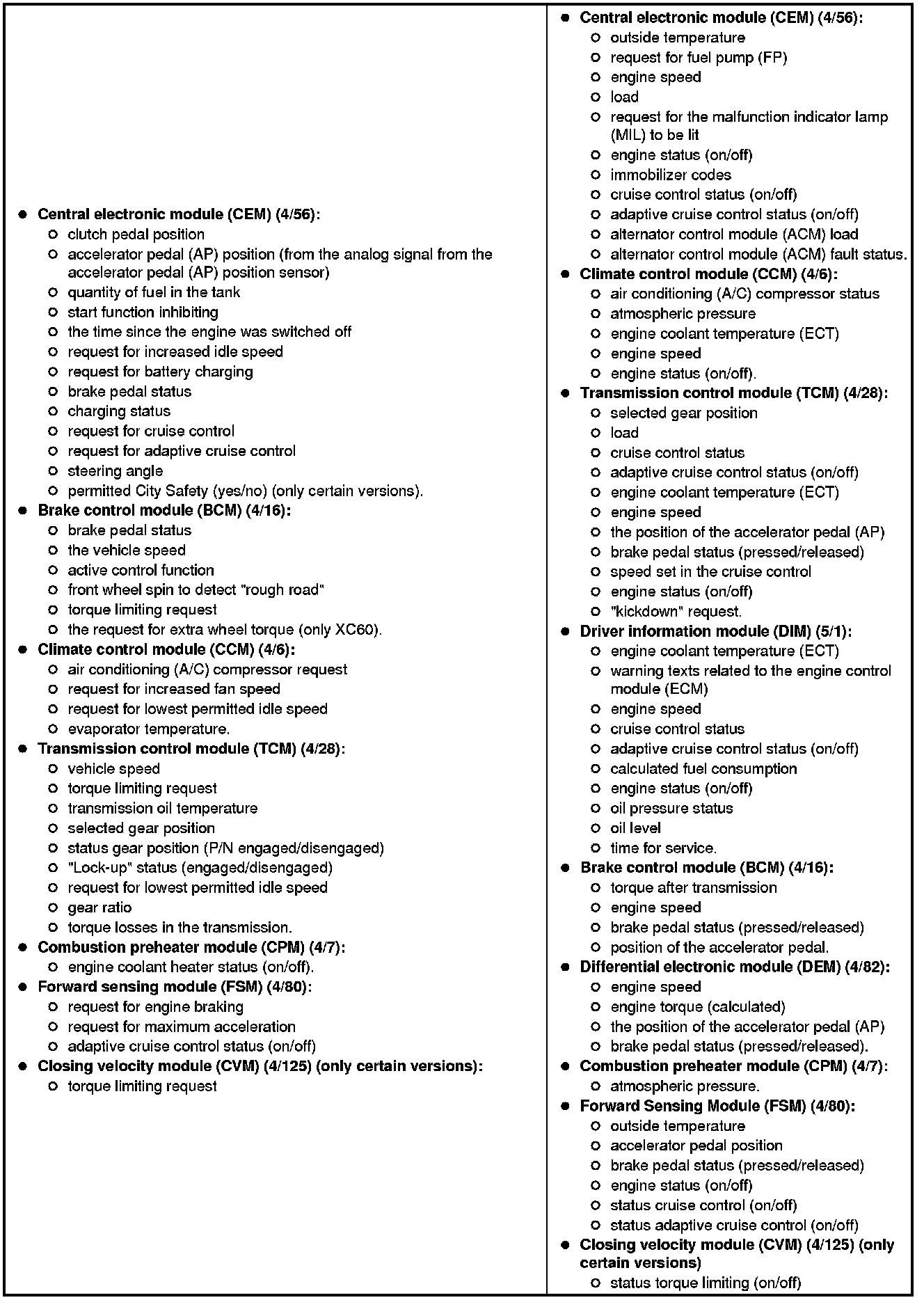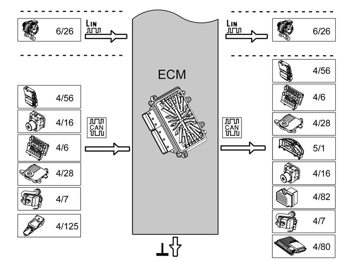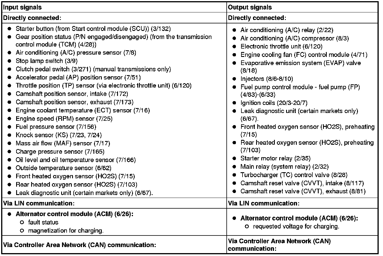 The table below summarizes the input signals to and output signals from the Engine Control Module (ECM). The signal types are divided into directly connected signals, serial communication and controller area network (CAN) communication. The illustration below displays the same information with the Volvo component designations.