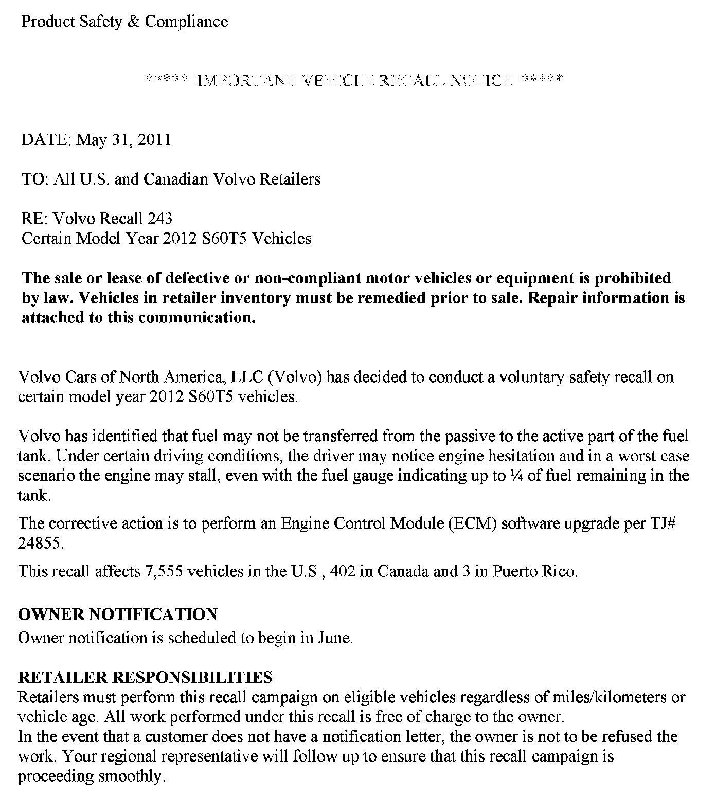 Recall - ECM Update For Fuel Pump Function/Stalling