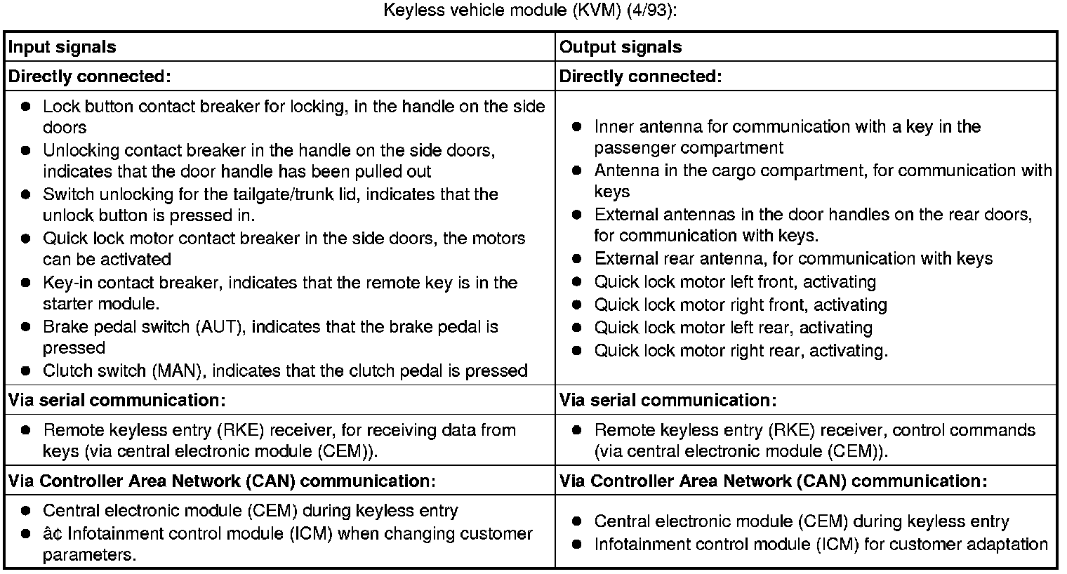 The tables below summarize the input and output signals to the units in the central locking system. The signal types are divided into directly connected signals, serial communication and controller area network (CAN) communication.