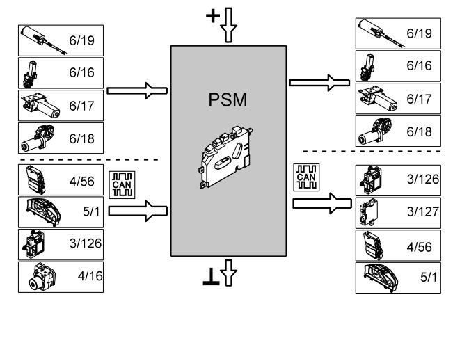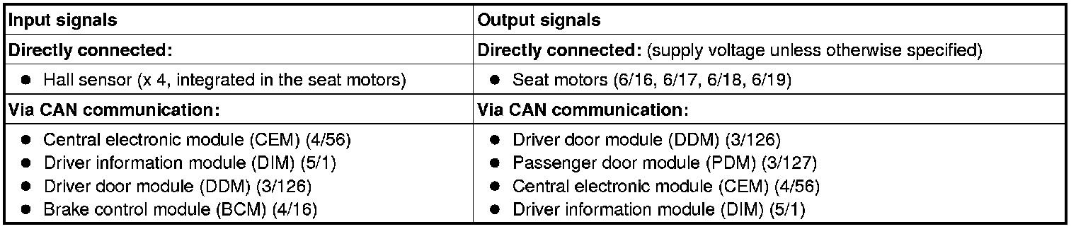 The table below summarizes the input signals to and output signals from the power seat module (PSM) (3/26). The signal types are divided into directly connected signals and CAN communication. The illustration below depicts the same information with Volvo component designations.