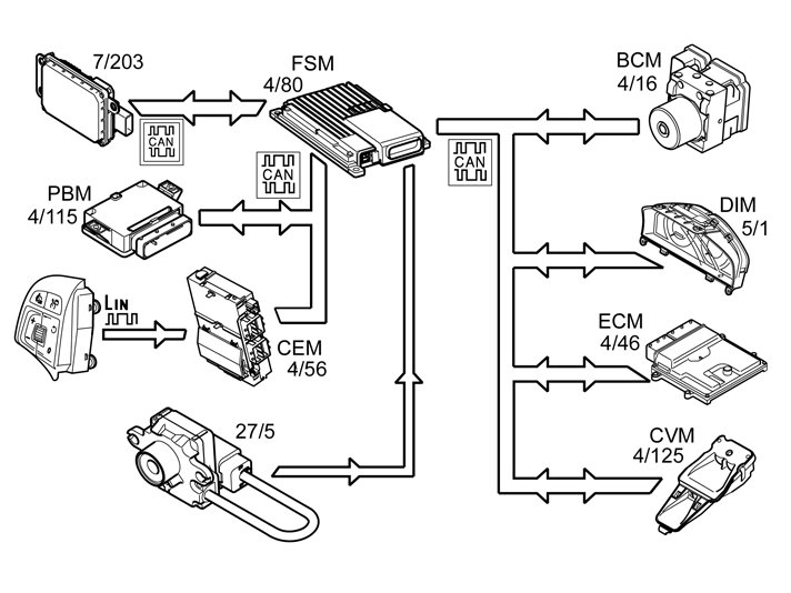 To change the interval setting, the driver presses one of the buttons on the Steering wheel switch left (SWSL) to increase or reduce the interval. Steering wheel switch left (SWSL) transmits information via LIN communication to Central electronic module (CEM) (4/56), stating which button has been activated. The Central electronic module (CEM) forwards the information via the CAN network to the Forward Sensing Module (FSM) (4/80).