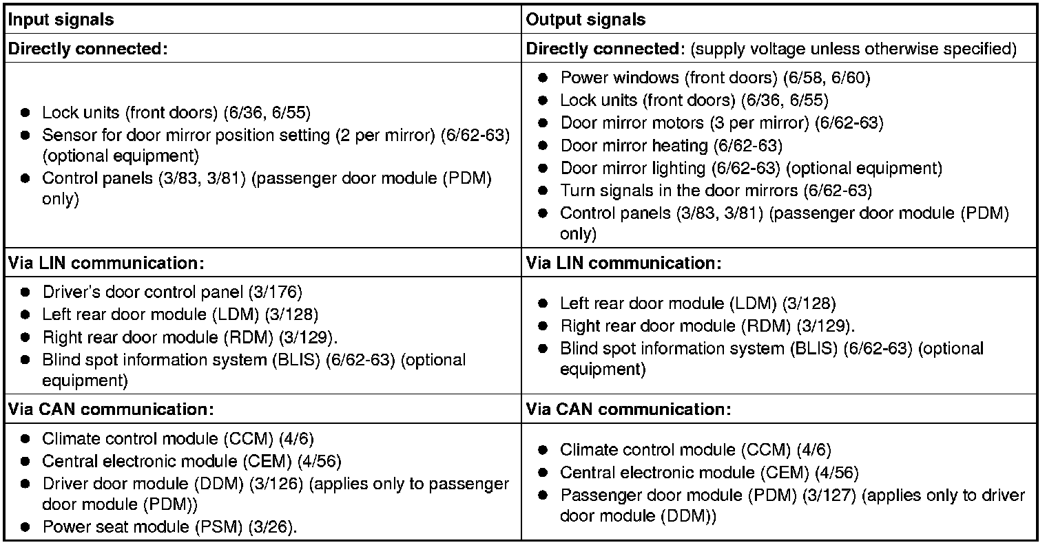 The table below summarizes the input signals to and output signals from the driver door module (DDM) and passenger door module (PDM). The signal types are divided into directly connected signals, LIN and CAN communication. The illustration below displays the same information with the Volvo component designations.